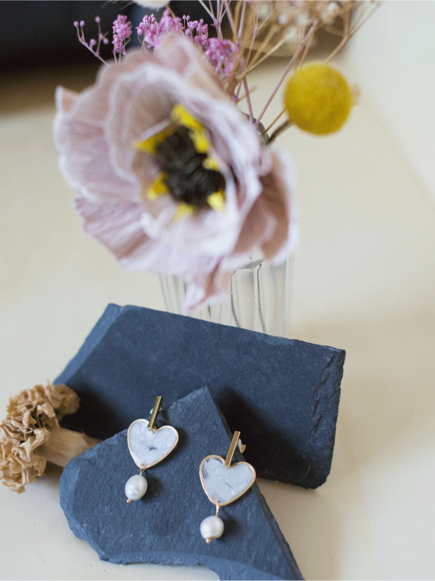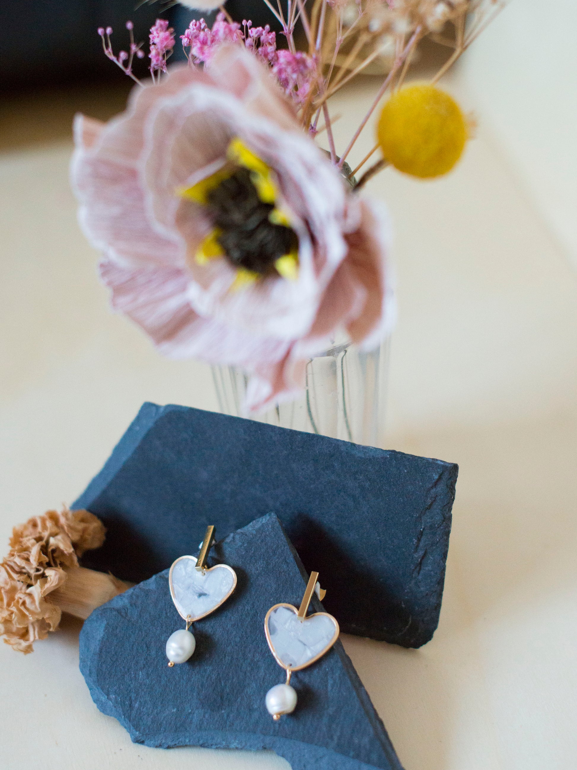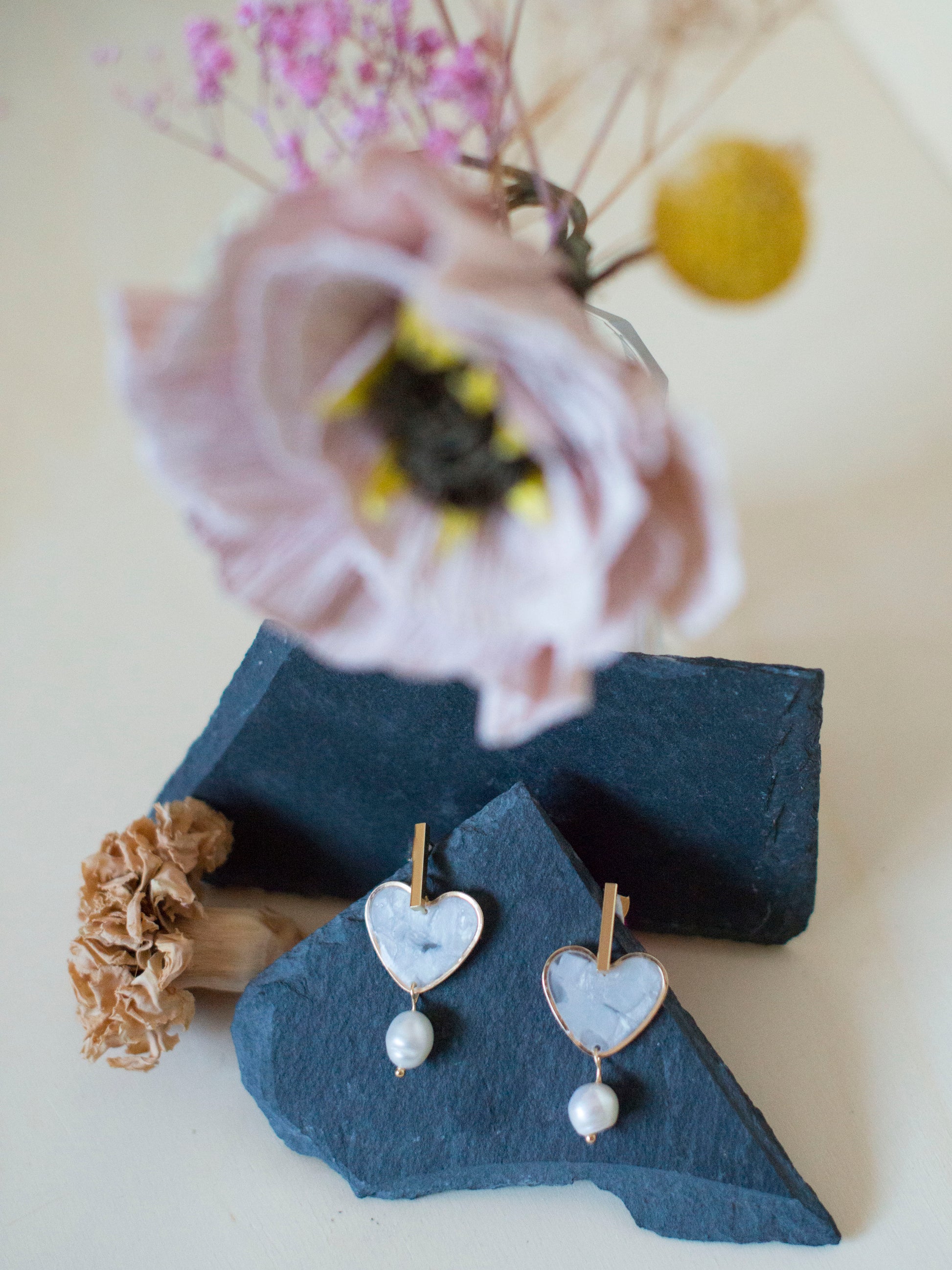 Die „Small Heart“-Ohrringe bestehen aus perlmuttfarbenen Weichspüler-Flaschenverschlüssen in Form eines kleinen Herzens, dem Symbol der Liebe ❤️