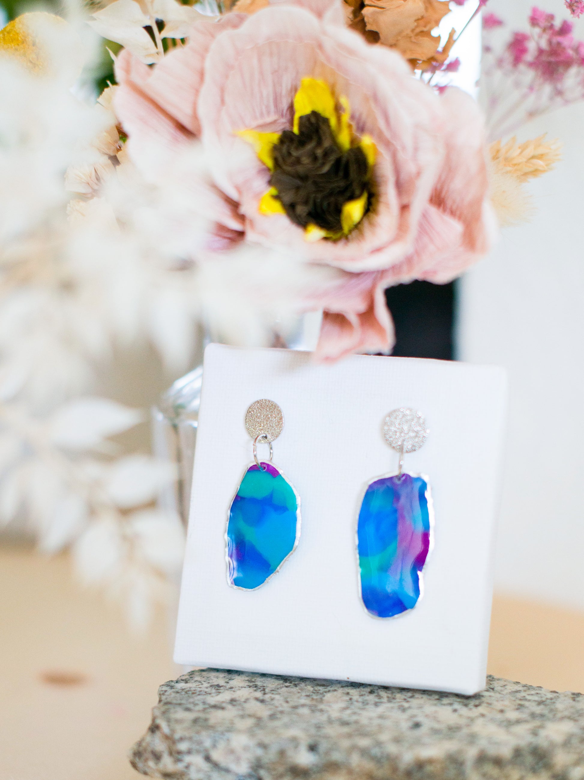 Seine tiefen Blautöne – mit einem Hauch von Transparenz – vermischen sich mit Smaragdgrün und einem Hauch Lila für ein asymmetrisches und originelles Ergebnis, das ihnen den Eindruck der Tiefen der Ozeane verleiht.